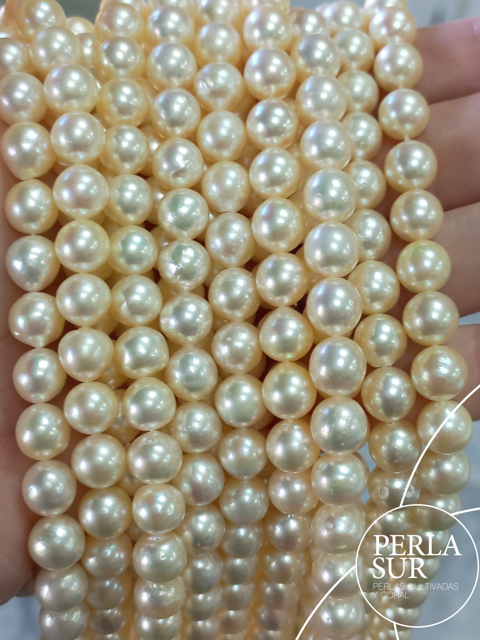 Hilo perla cultivada AKOYA 7’5-8mm semibarroca tono dorado, con mucho cultivo y brillo.