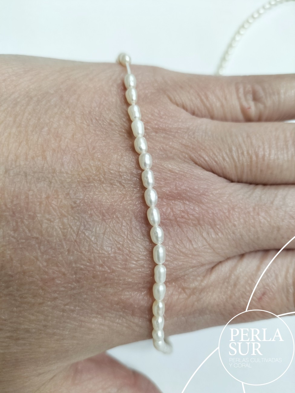 Hilo perla cultivada agua dulce, perla ovalada o tipo arroz (llamada aljófar). Ancho de la perla: 2.5-3mm.