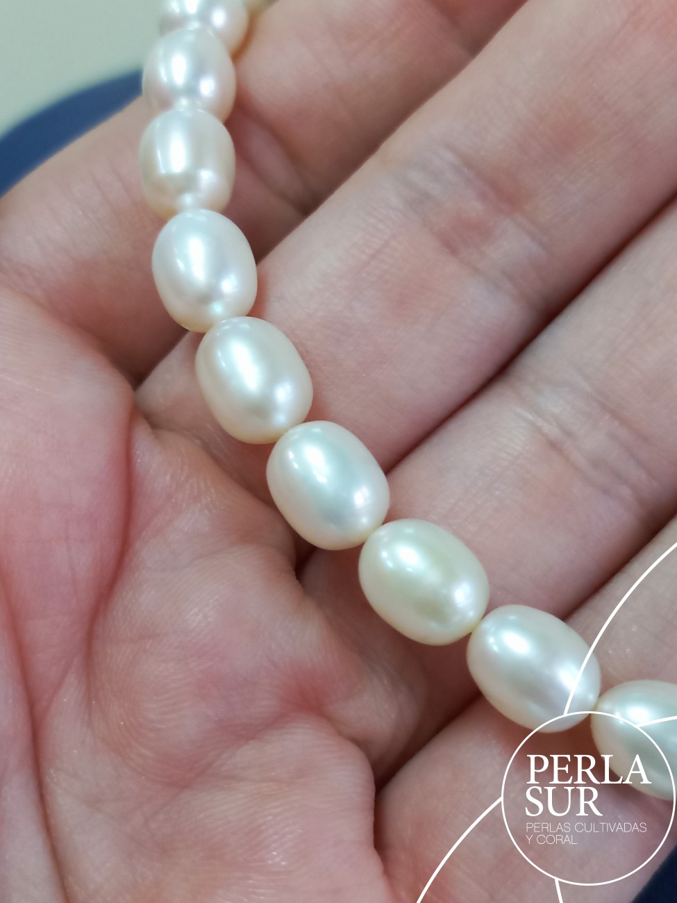 Hilo perla agua dulce, forma oval, de 7x9mm. Mucho brillo.