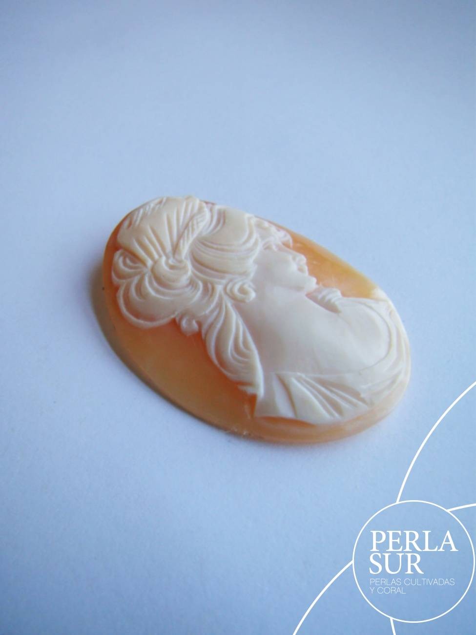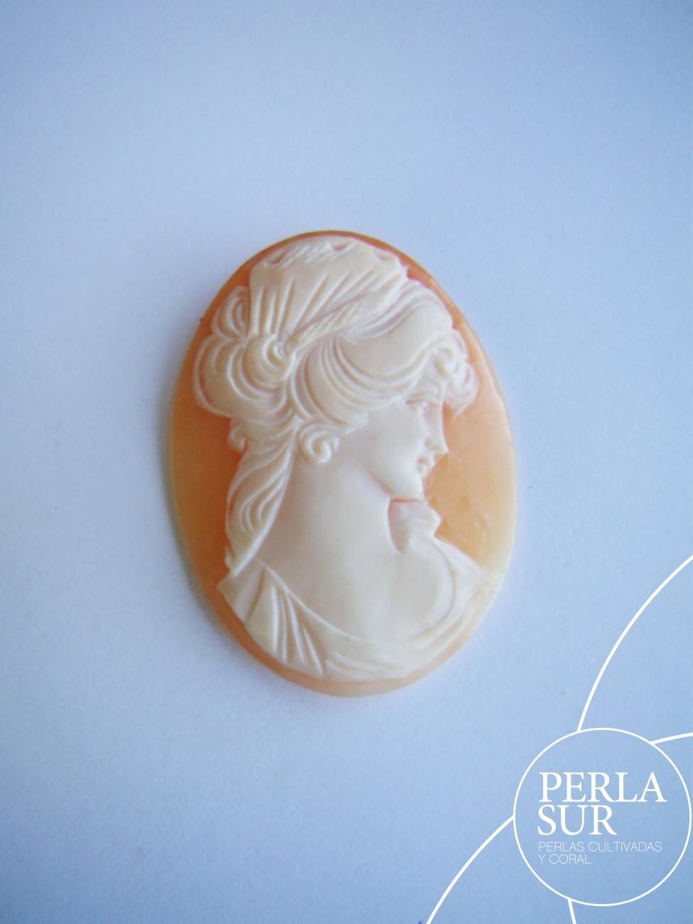 Camafeo de concha de caracola Cassis madagascariensis con 3cm de ancho y 4cm de largo. Efigie de mujer. El grosor y la curvatura pueden variar debido a que es un producto hecho a mano y de origen orgánico.