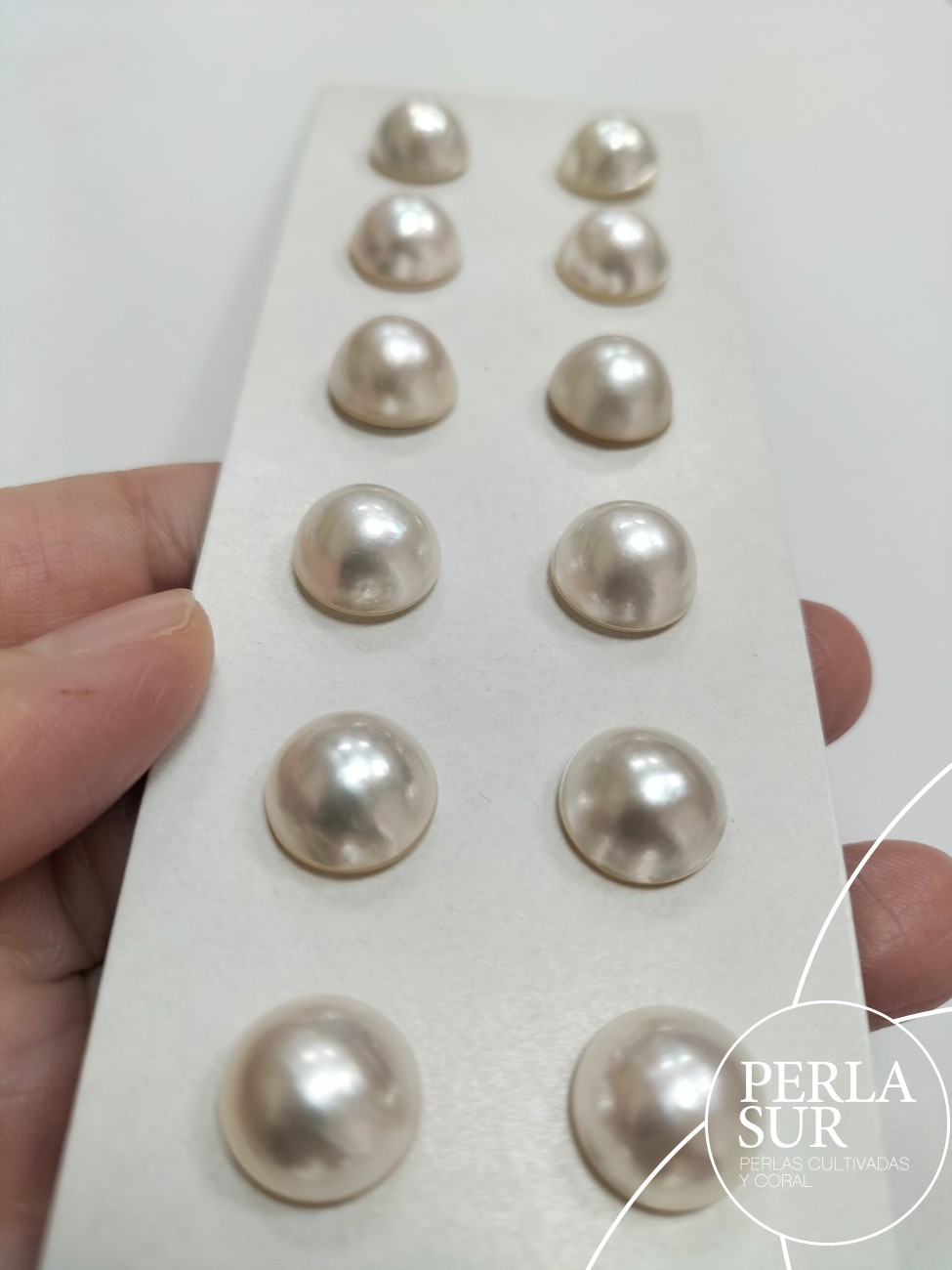 Perla Mabe o japonesa, tono crema grisáceo. En general son altas. Medida 12mm exactos.
