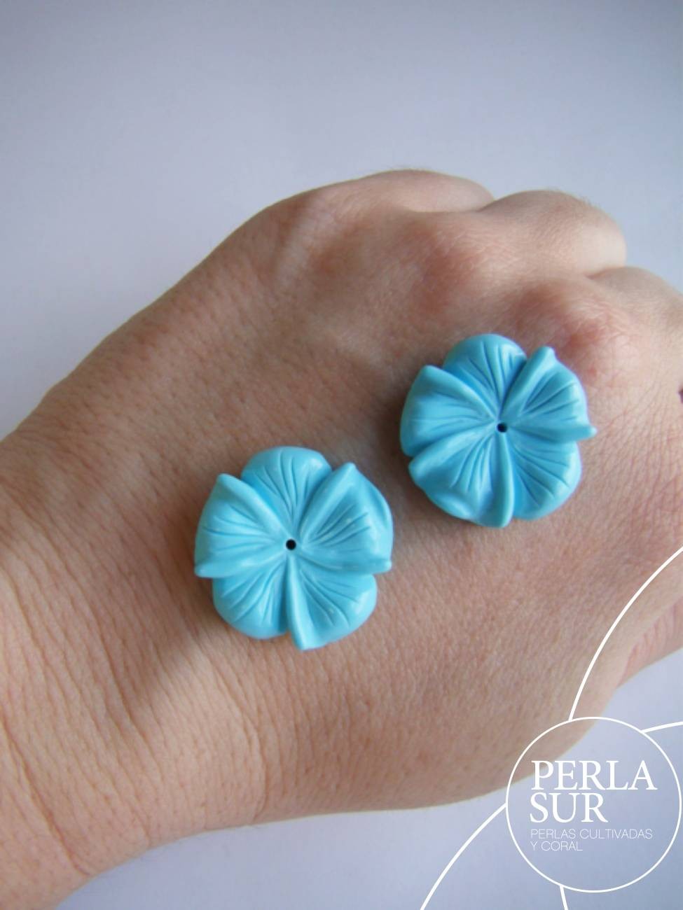 Pareja flor de 5 pétalos 20mm de turquesa reconstituida de alta calidad. No se deteriora el color. Precio por pareja. Con taladro en el centro.
