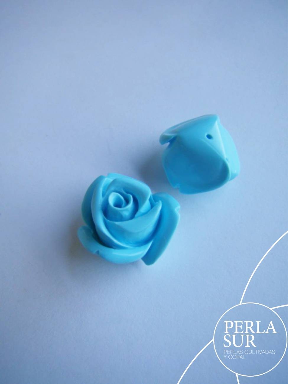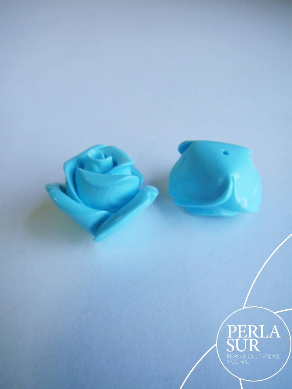 Pareja de Rosas de 18mm hechas de turquesa reconstituida de alta calidad. El color no se deteriora. Tienen medio taladro en la base. Precio por pareja.
