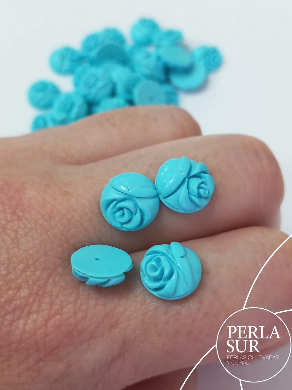 Piezas de Rosas planas 10mm turquesa reconstituida de alta calidad. El color no se deteriora. Tienen un pequeño taladro en la base. Precio por unidad.